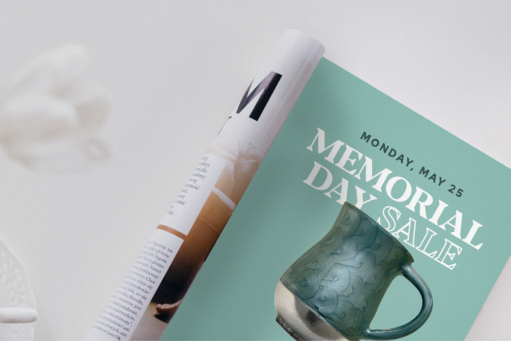 Magazine ad mockup on a table near a cup off coffee and tulips.