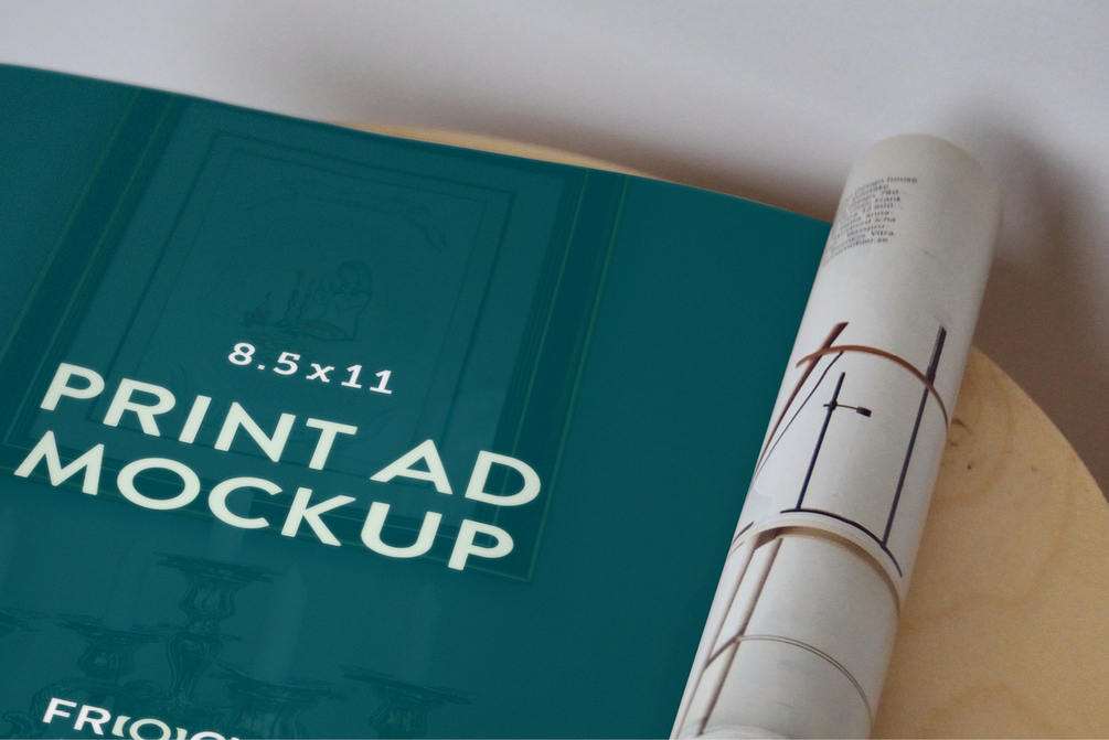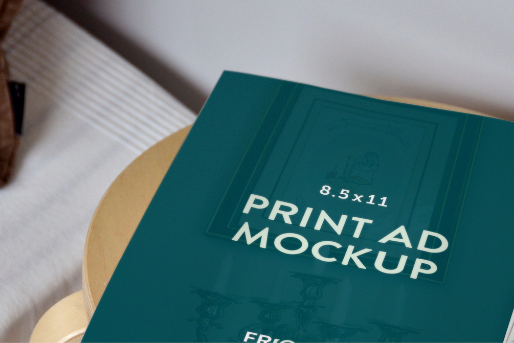 Magazine Ad on Bedside Table Photorealistic Mockup