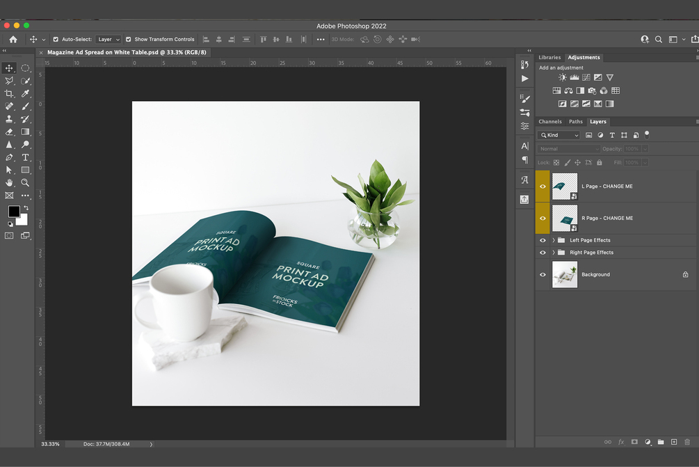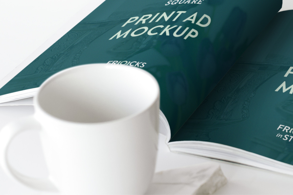 Magazine Ad Spread Photorealistic Mockup by White Table